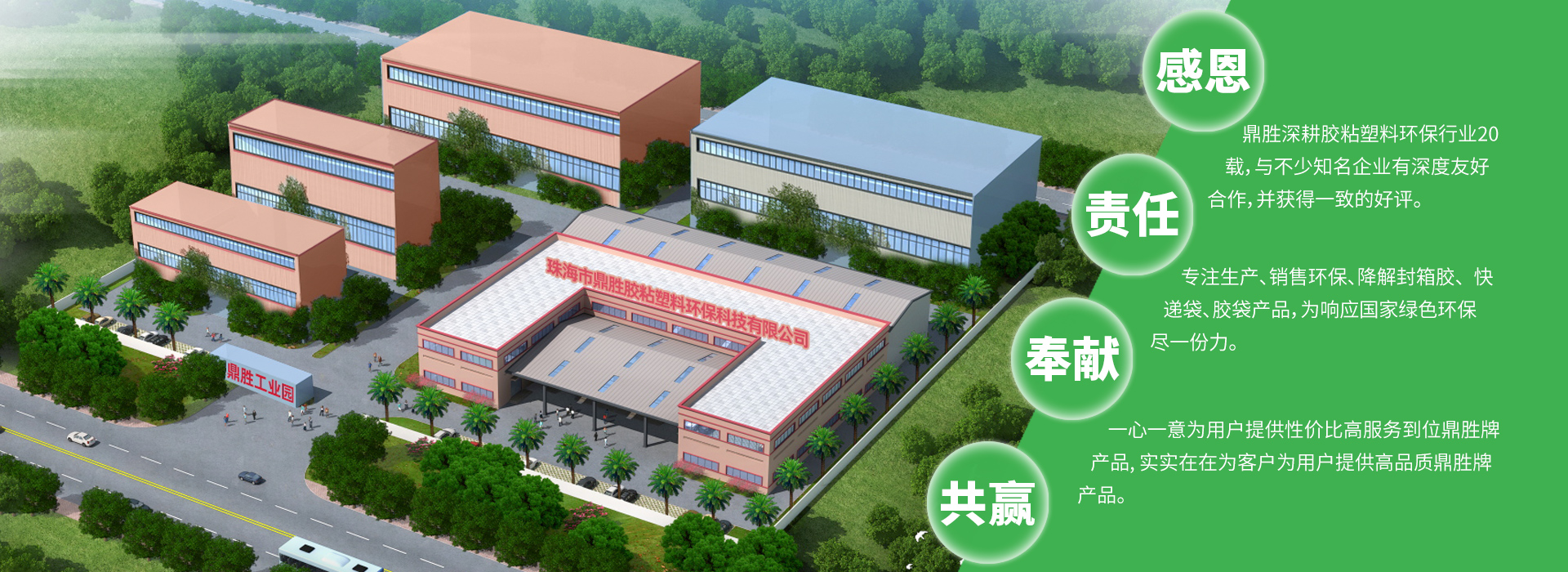 鼎勝是一家不斷創新發展的環保降解、膠袋、封箱膠企業, 創始于廣東美麗珠海, 公司注冊資金1000萬, 花園式廠房超一萬平方米。